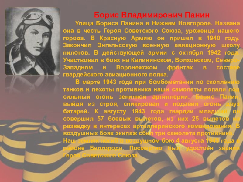 Наш земляк погиб в воздушном бою 4 августа 1943 года в районе Белгорода. Посмертно был удостоен звания Героя Советского Союза.