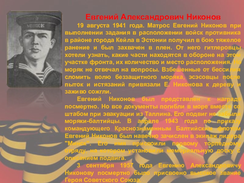 3 сентября 1957 года Евгению Александровичу Никонову посмертно было присвоено высокое звание Героя Советского Союза.
