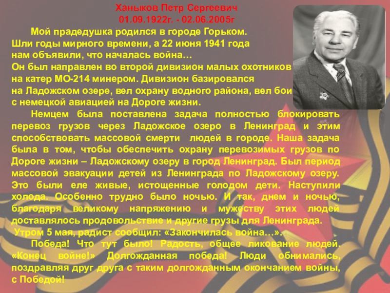 Немцем была поставлена задача полностью блокировать перевоз грузов через Ладожское озеро в Ленинград и этим способствовать массовой смерти людей в городе. Наша задача была в том, чтобы обеспечить охрану перевозимых грузов по Дороге жизни – Ладожскому озеру в город Ленинград. Был период массовой эвакуации детей из Ленинграда по Ладожскому озеру. Это были еле живые, истощенные голодом дети. Наступили холода. Особенно трудно было ночью. И так, днем и ночью, благодаря великому напряжению и мужеству этих людей доставлялось продовольствие и другие грузы для Ленинграда.