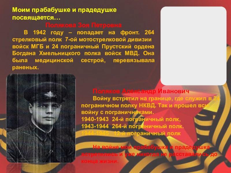 войск МГБ и 24 пограничный Прустский ордена Богдана Хмельницкого полка войск МВД. Она была медицинской сестрой, перевязывала раненых.