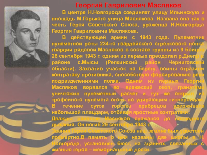 М.Горького улица Маслякова. Названа она так в честь Героя Советского Союза, уроженца Н.Новгорода Георгия Гавриловича Маслякова.