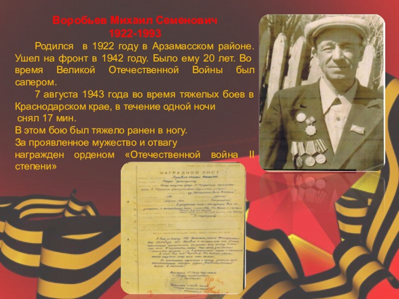 на фронт в 1942 году. Было ему 20 лет. Во время Великой Отечественной Войны был сапером.