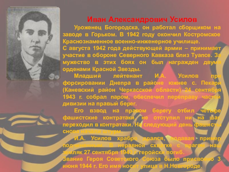 И.А. Усилов храбро дрался, подавая пример подчиненным. В неравной схватке с врагом наш земляк 27 сентября 1943 г. геройски погиб.