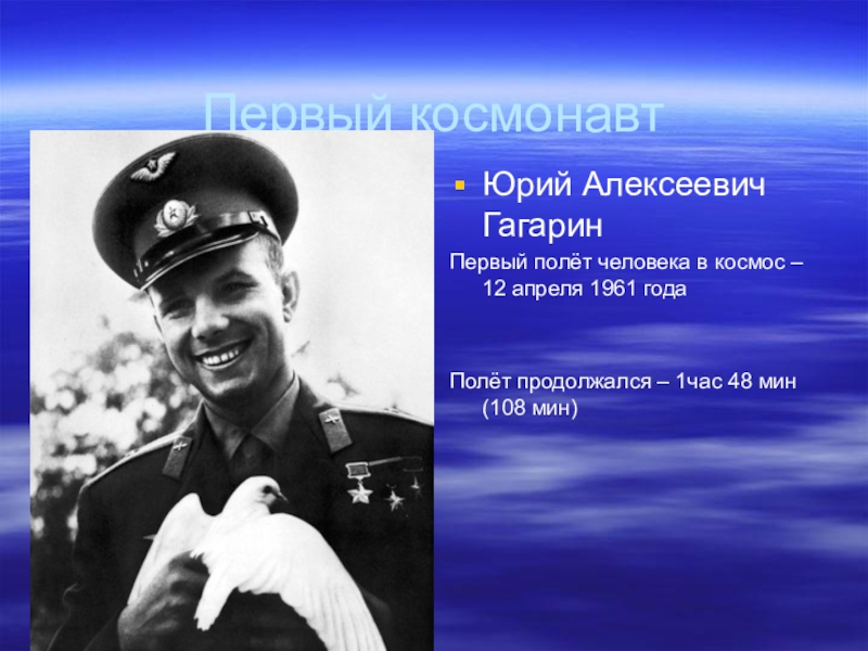 Первый космонавтЮрий Алексеевич ГагаринПервый полёт человека в космос – 12 апреля 1961 годаПолёт продолжался – 1час 48