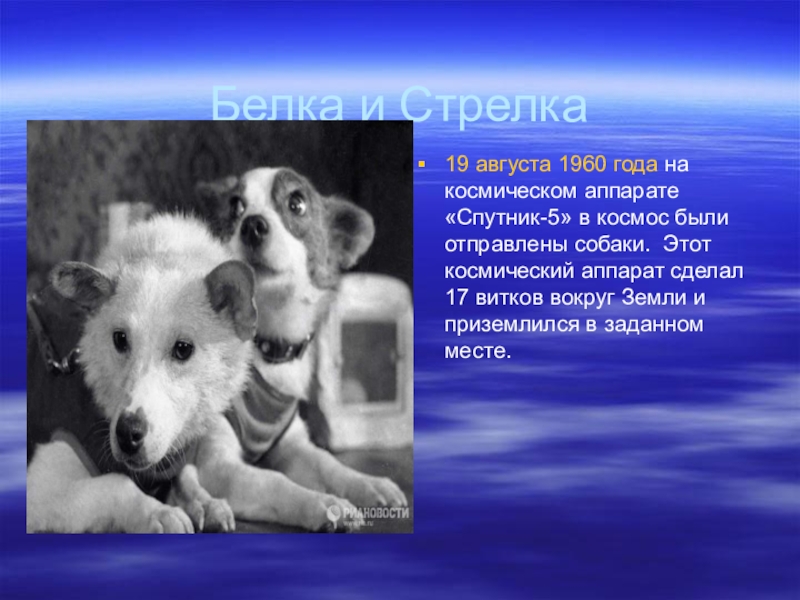 космос были отправлены собаки. Этот космический аппарат сделал 17 витков вокруг Земли и приземлился в заданном месте.
