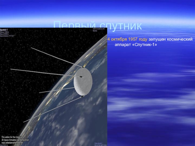 Первый спутник4 октября 1957 году запущен космический аппарат «Спутник-1»