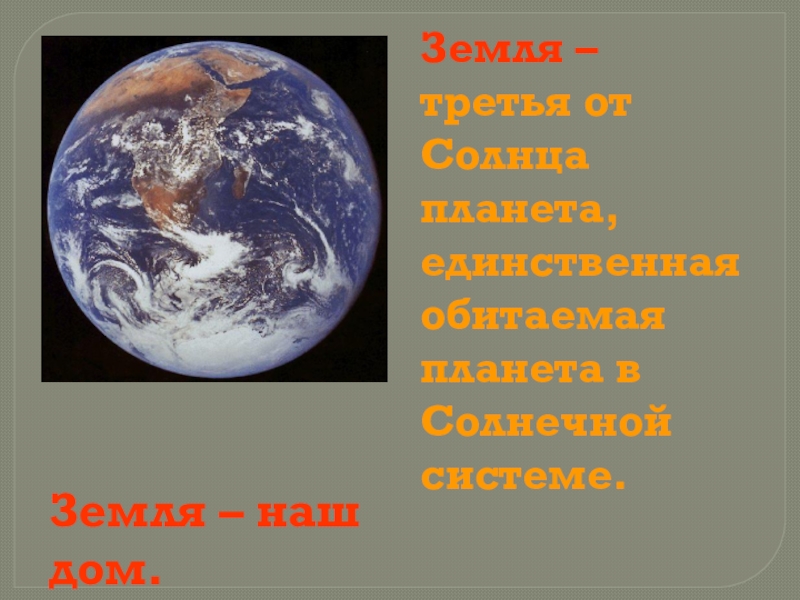 Земля –третья отСолнца планета,единственная обитаемаяпланета в Солнечнойсистеме.Земля – наш дом.