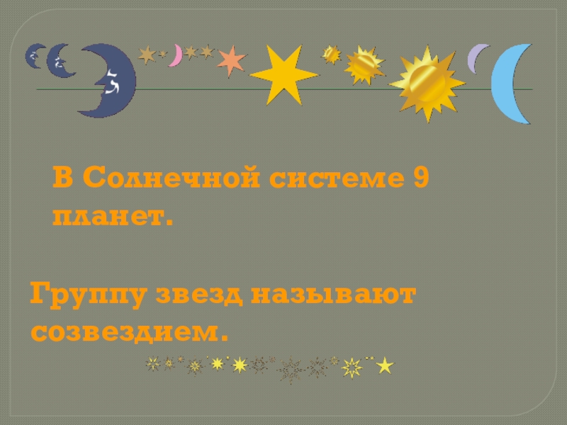 В Солнечной системе 9 планет.Группу звезд называют созвездием.