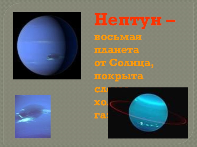 Нептун –восьмая планетаот Солнца, покрыта слоемхолодных газов