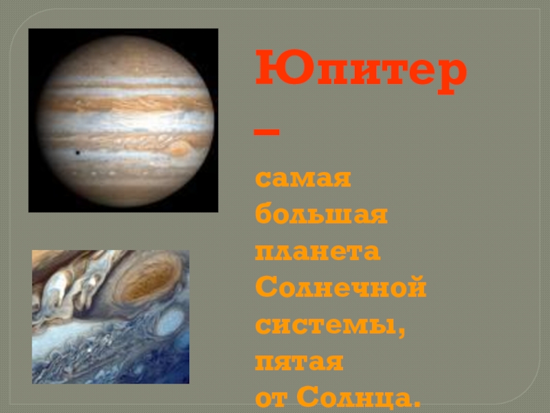 Юпитер –самая большаяпланета Солнечной системы, пятаяот Солнца.