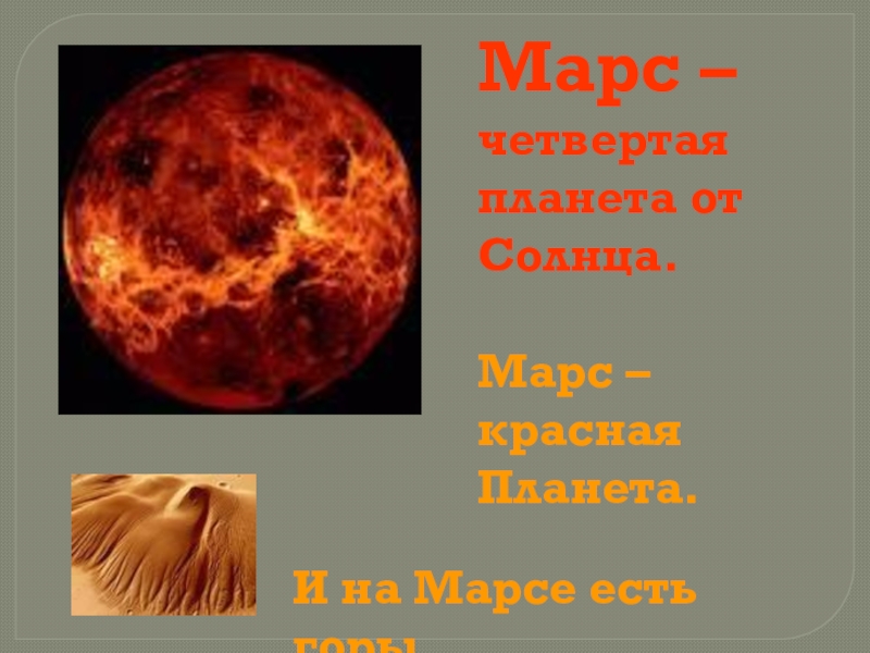 Марс –четвертаяпланета отСолнца.Марс – краснаяПланета.И на Марсе есть горы.