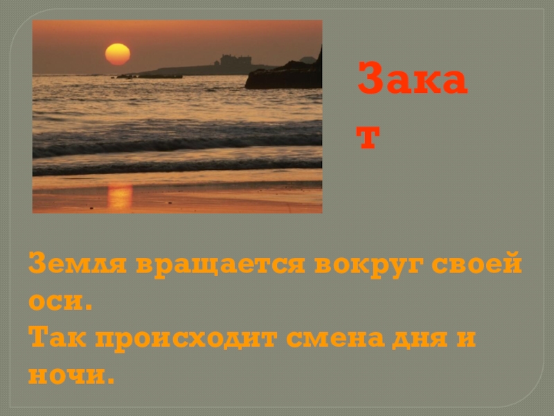 Земля вращается вокруг своей оси.Так происходит смена дня и ночи.Закат
