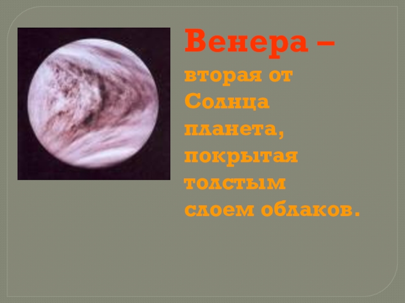 Венера –вторая от Солнца планета,покрытая толстымслоем облаков.