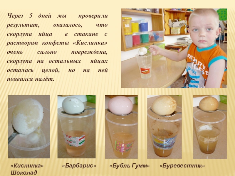 Слайд 10Через 5 дней мы проверили результат, оказалось, что скорлупа яйца в