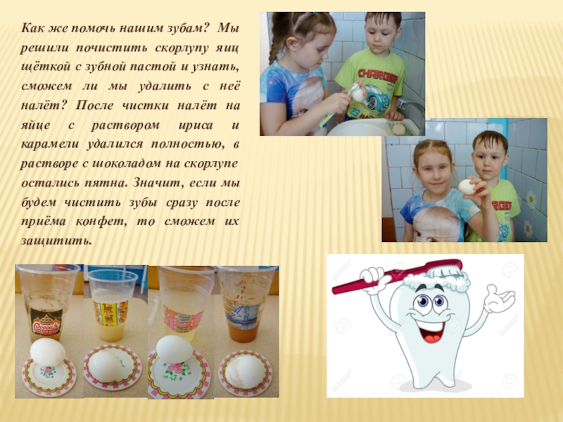с зубной пастой и узнать, сможем ли мы удалить с неё налёт? После чистки налёт на яйце с раствором ириса и карамели удалился полностью, в растворе с шоколадом на скорлупе остались пятна. Значит, если мы будем чистить зубы сразу после приёма конфет, то сможем их защитить.