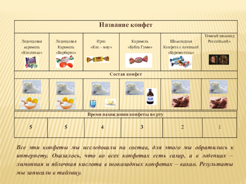 к интернету. Оказалось, что во всех конфетах есть сахар, а в леденцах –лимонная и яблочная кислота в шоколадных конфетах – какао. Результаты мы записали в таблицу.