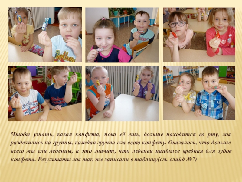 мы разделились на группы, каждая группа ела свою конфету. Оказалось, что дольше всего мы ели леденцы, а это значит, что леденец наиболее вредная для зубов конфета. Результаты мы так же записали в таблицу(см. слайд №7)