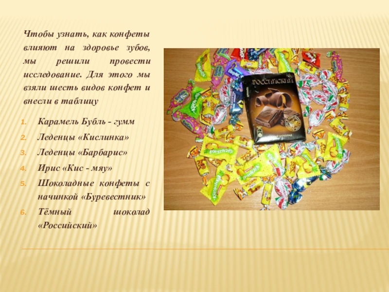Слайд 6Чтобы узнать, как конфеты влияют на здоровье зубов, мы решили провести