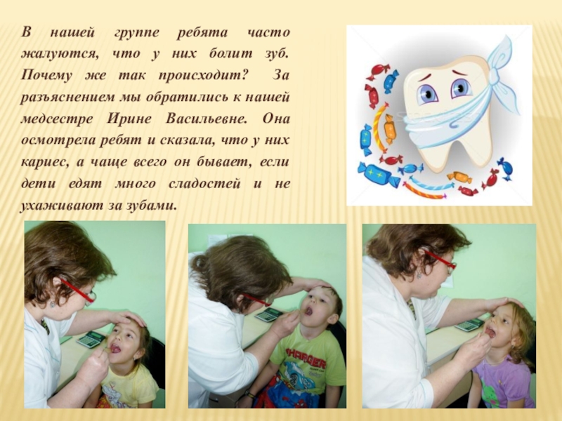 Почему же так происходит? За разъяснением мы обратились к нашей медсестре Ирине Васильевне. Она осмотрела ребят и сказала, что у них кариес, а чаще всего он бывает, если дети едят много сладостей и не ухаживают за зубами.