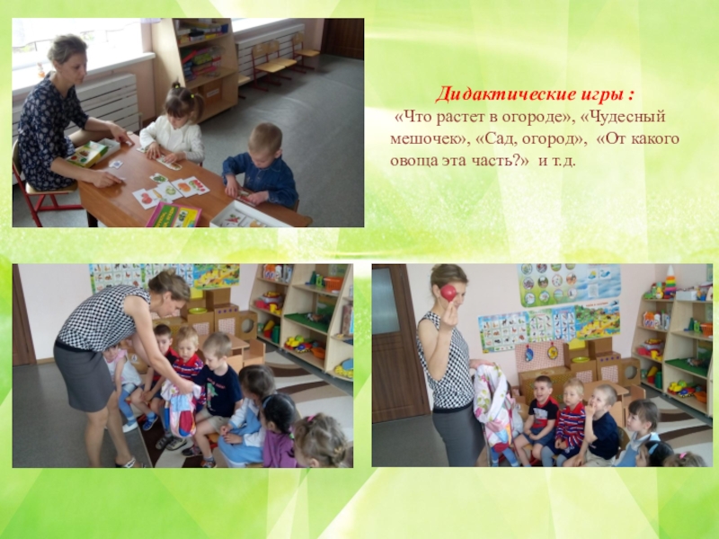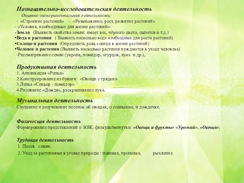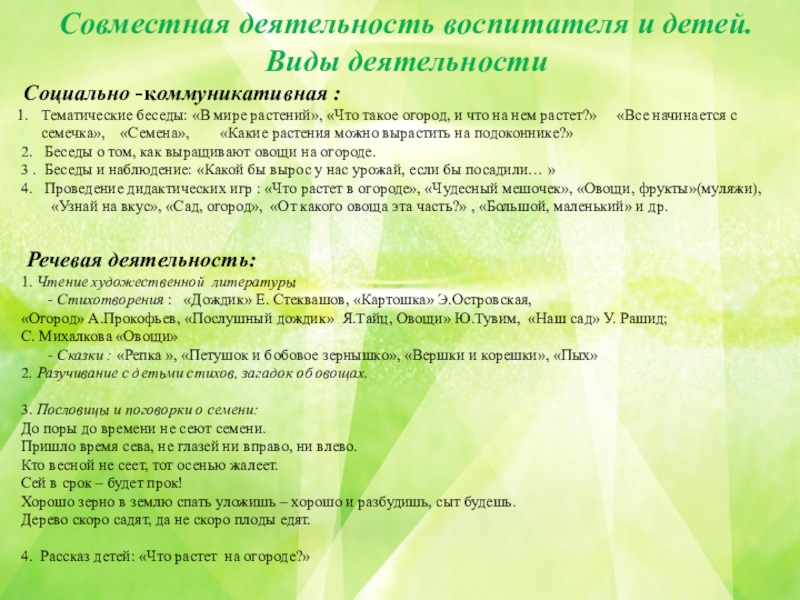 Активизация словаря: лук, чеснок, томат (помидор), морковь, картофель, огурец, перец, семена, земля, вода, солнце, трава, сажать, поливать, смотреть, наблюдать.