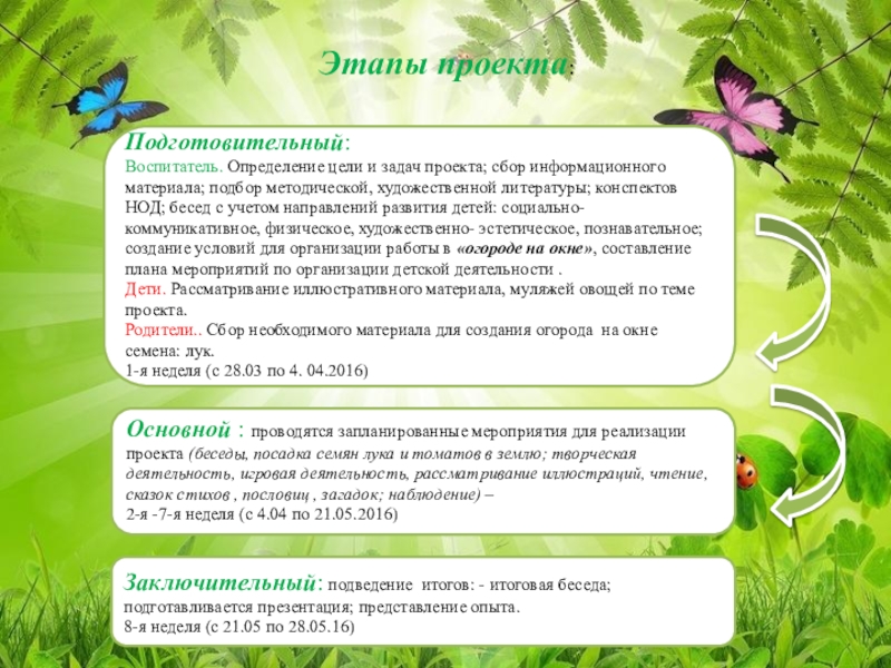 Основной : проводятся запланированные мероприятия для реализации проекта (беседы, посадка семян лука и томатов в землю; творческая деятельность, игровая деятельность, рассматривание иллюстраций, чтение, сказок стихов , пословиц , загадок; наблюдение) –