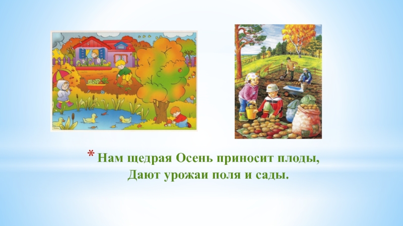 Слайд 11Нам щедрая Осень приносит плоды, Дают урожаи поля и сады.