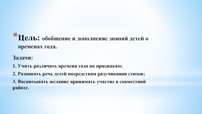 Слайд 2Цель: обобщение и дополнение знаний детей о временах года.