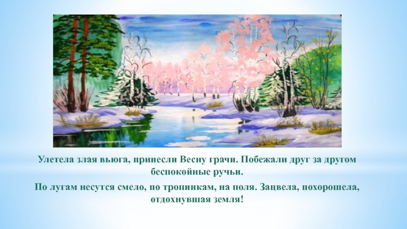 Слайд 8Улетела злая вьюга, принесли Весну грачи. Побежали друг за другом беспокойные