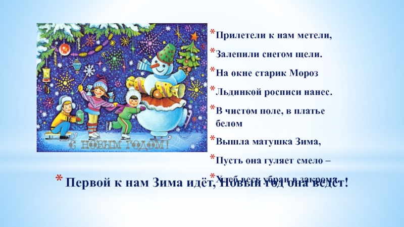 Первой к нам Зима идёт, Новый год она ведёт!Прилетели к нам метели,Залепили снегом щели.На окне старик МорозЛьдинкой