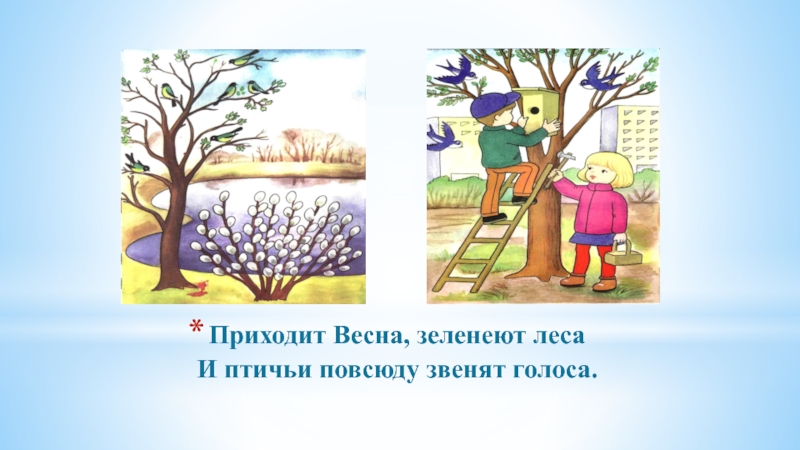 Слайд 7Приходит Весна, зеленеют леса И птичьи повсюду звенят голоса.
