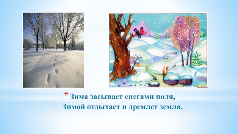 Слайд 4Зима засыпает снегами поля, Зимой отдыхает и дремлет земля.