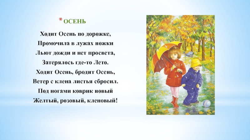 ОСЕНЬХодит Осень по дорожке,Промочила в лужах ножкиЛьют дожди и нет просвета,Затерялось где-то Лето.Ходит Осень, бродит Осень,Ветер с