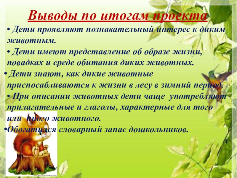 У детей слабо развита связная речь, недостаточный словарный запас о жизни диких животных