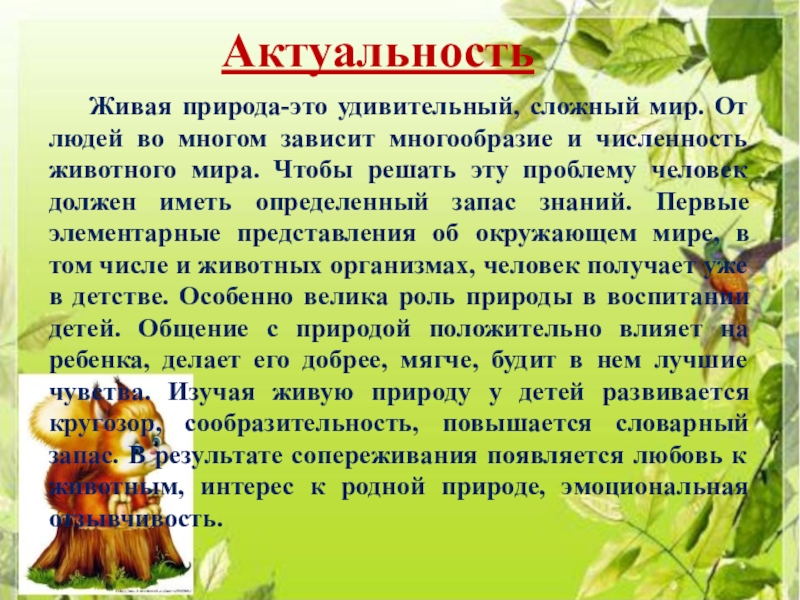 и численность животного мира. Чтобы решать эту проблему человек должен иметь определенный запас знаний. Первые элементарные представления об окружающем мире, в том числе и животных организмах, человек получает уже в детстве. Особенно велика роль природы в воспитании детей. Общение с природой положительно влияет на ребенка, делает его добрее, мягче, будит в нем лучшие чувства. Изучая живую природу у детей развивается кругозор, сообразительность, повышается словарный запас. В результате сопереживания появляется любовь к животным, интерес к родной природе, эмоциональная отзывчивость.