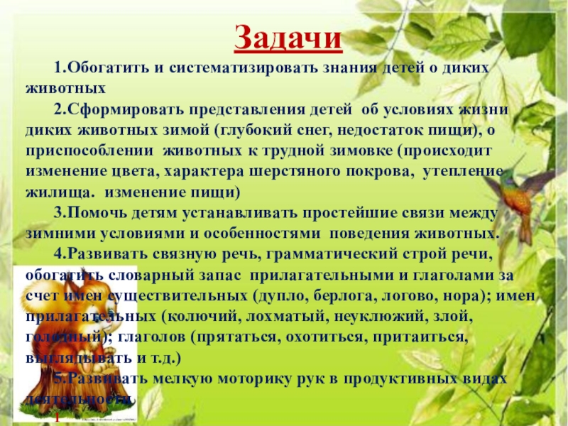 4.Развивать связную речь, грамматический строй речи, обогатить словарный запас прилагательными и глаголами за счет имен существительных (дупло, берлога, логово, нора); имен прилагательных (колючий, лохматый, неуклюжий, злой, голодный); глаголов (прятаться, охотиться, притаиться, выглядывать и т.д.)