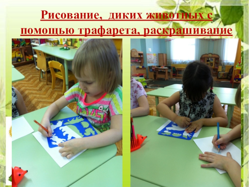 Слайд 23Рисование, диких животных с помощью трафарета, раскрашивание