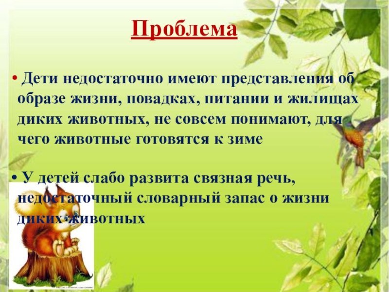 Дети недостаточно имеют представления об образе жизни, повадках, питании и жилищах диких животных, не совсем понимают, для чего животные готовятся к зиме