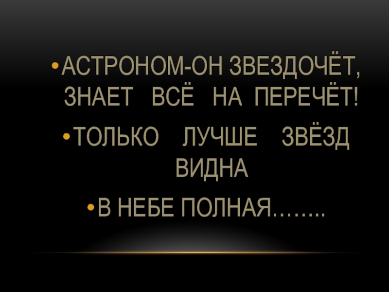 АСТРОНОМ-ОН ЗВЕЗДОЧЁТ, ЗНАЕТ  ВСЁ  НА ПЕРЕЧЁТ!ТОЛЬКО  ЛУЧШЕ  ЗВЁЗД ВИДНАВ НЕБЕ ПОЛНАЯ……..