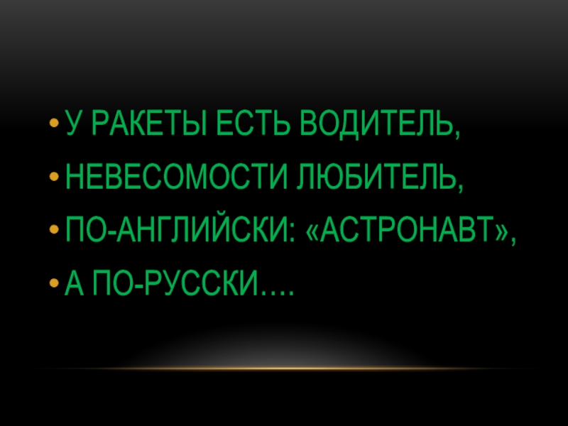 У РАКЕТЫ ЕСТЬ ВОДИТЕЛЬ,НЕВЕСОМОСТИ ЛЮБИТЕЛЬ,ПО-АНГЛИЙСКИ: «АСТРОНАВТ»,А ПО-РУССКИ….