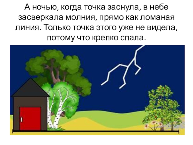 Слайд 12А ночью, когда точка заснула, в небе засверкала молния, прямо как