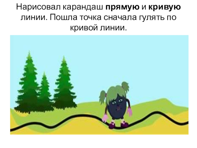 Слайд 5Нарисовал карандаш прямую и кривую линии. Пошла точка сначала гулять по