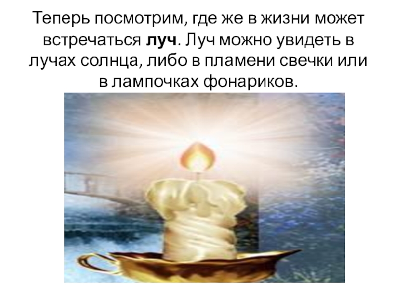 Слайд 19Теперь посмотрим, где же в жизни может встречаться луч. Луч можно