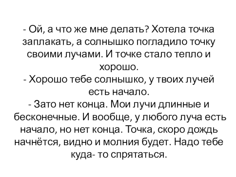 солнышко погладило точку своими лучами. И точке стало тепло и хорошо. - Хорошо тебе солнышко, у твоих лучей есть начало. - Зато нет конца. Мои лучи длинные и бесконечные. И вообще, у любого луча есть начало, но нет конца. Точка, скоро дождь начнётся, видно и молния будет. Надо тебе куда- то спрятаться.