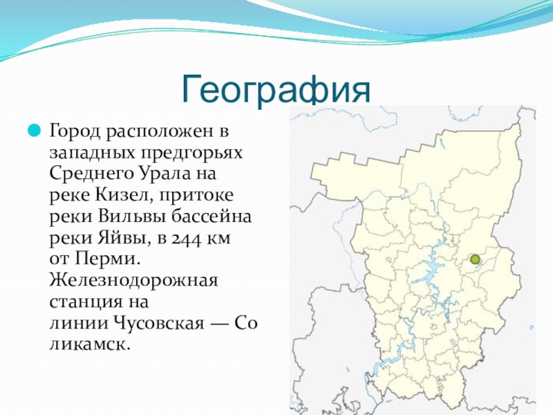 Город расположен в западных предгорьях Среднего Урала на реке Кизел, притоке реки
