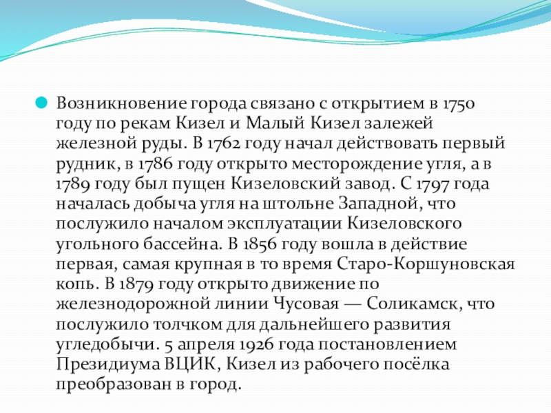 Слайд 5Возникновение города связано с открытием в 1750 году по рекам Кизел и Малый Кизел залежей железной руды.