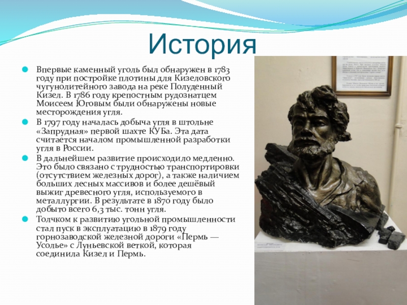 Впервые каменный уголь был обнаружен в 1783 году при постройке плотины для Кизеловского чугунолитейного