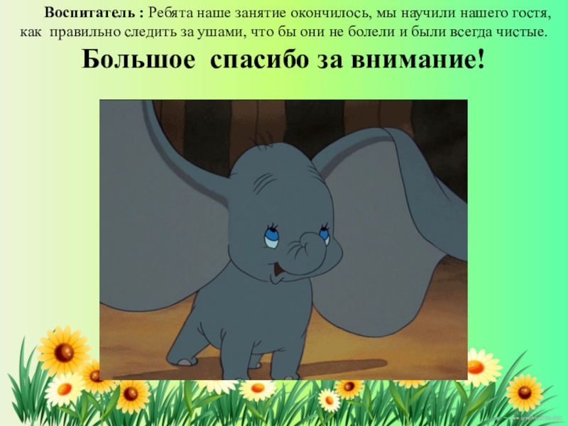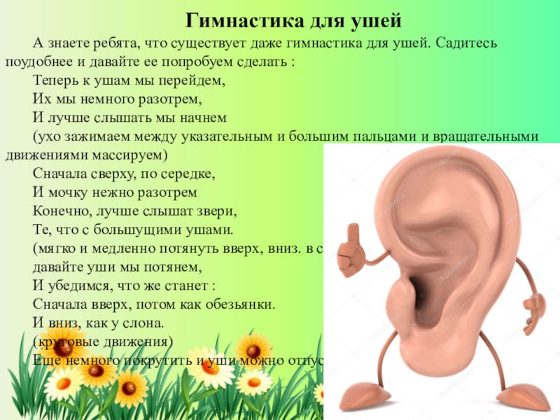 Слайд 6Воспитатель:А вы знаете, ребята, чтобы уши не болели и слух оставался