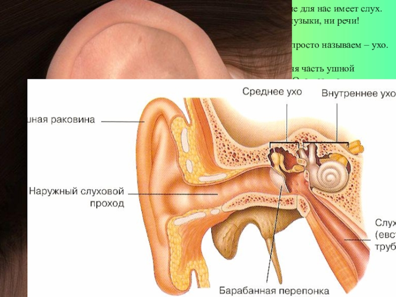 слух. Если бы у нас не было слуха, то мы не слышали бы не ручейка, ни музыки, ни речи!