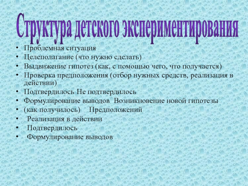 Структура детского экспериментирования Проблемная ситуацияЦелеполагание (что нужно сделать)Выдвижение гипотез (как, с помощью чего, что получается)Проверка предположения (отбор