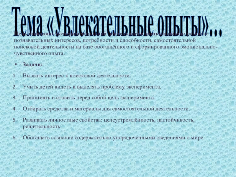 Тема «Увлекательные опыты»…Цель поисково-экспериментальной деятельности дошкольников: развитие познавательных интересов, потребности и способности, самостоятельной поисковой деятельности на базе обогащённого и сформированного эмоционально-чувственного опыта.Задачи:Вызвать интерес к поисковой деятельности.Учить детей видеть и выделять проблему эксперимента.Принимать и ставить перед собой цель